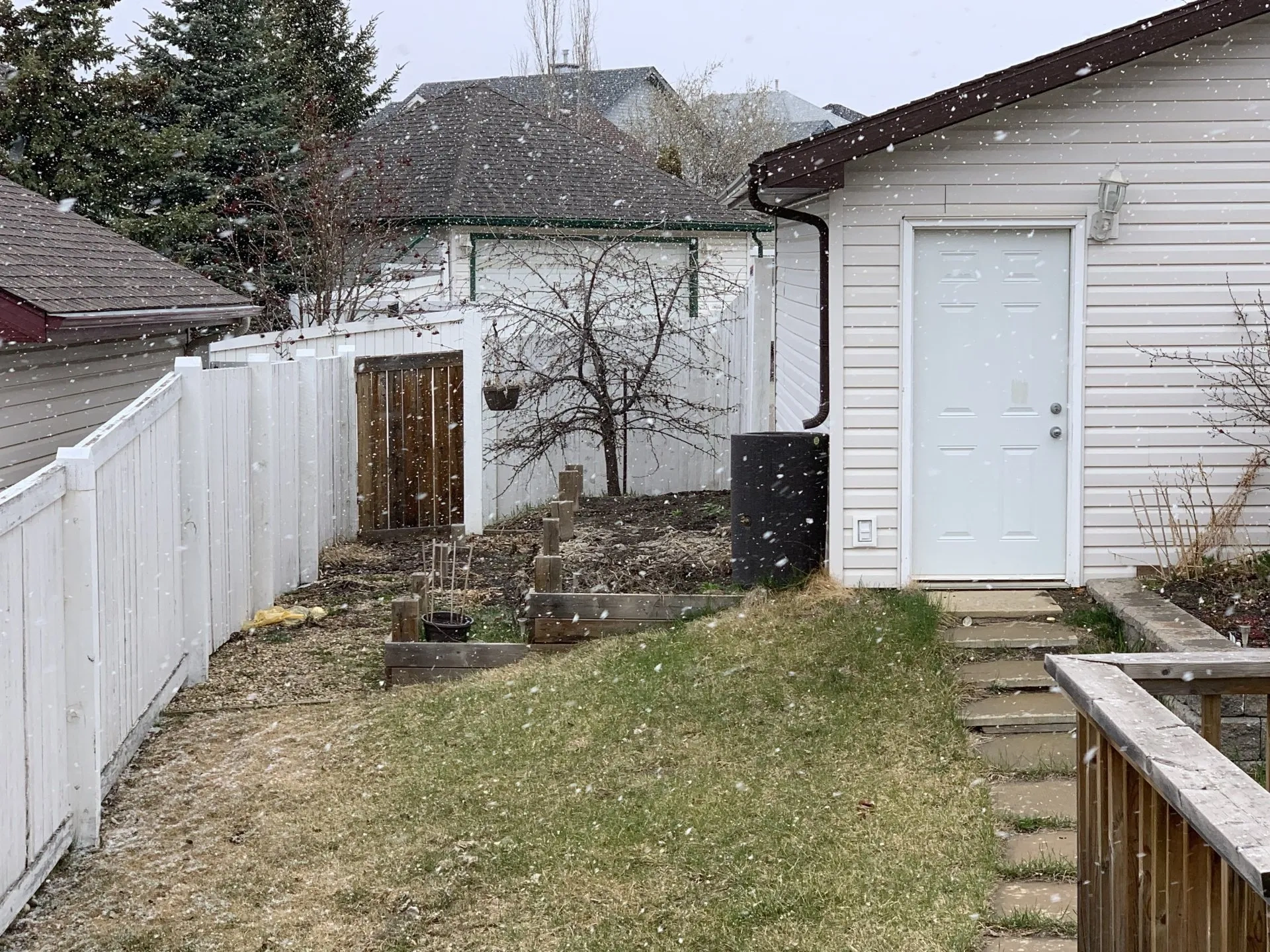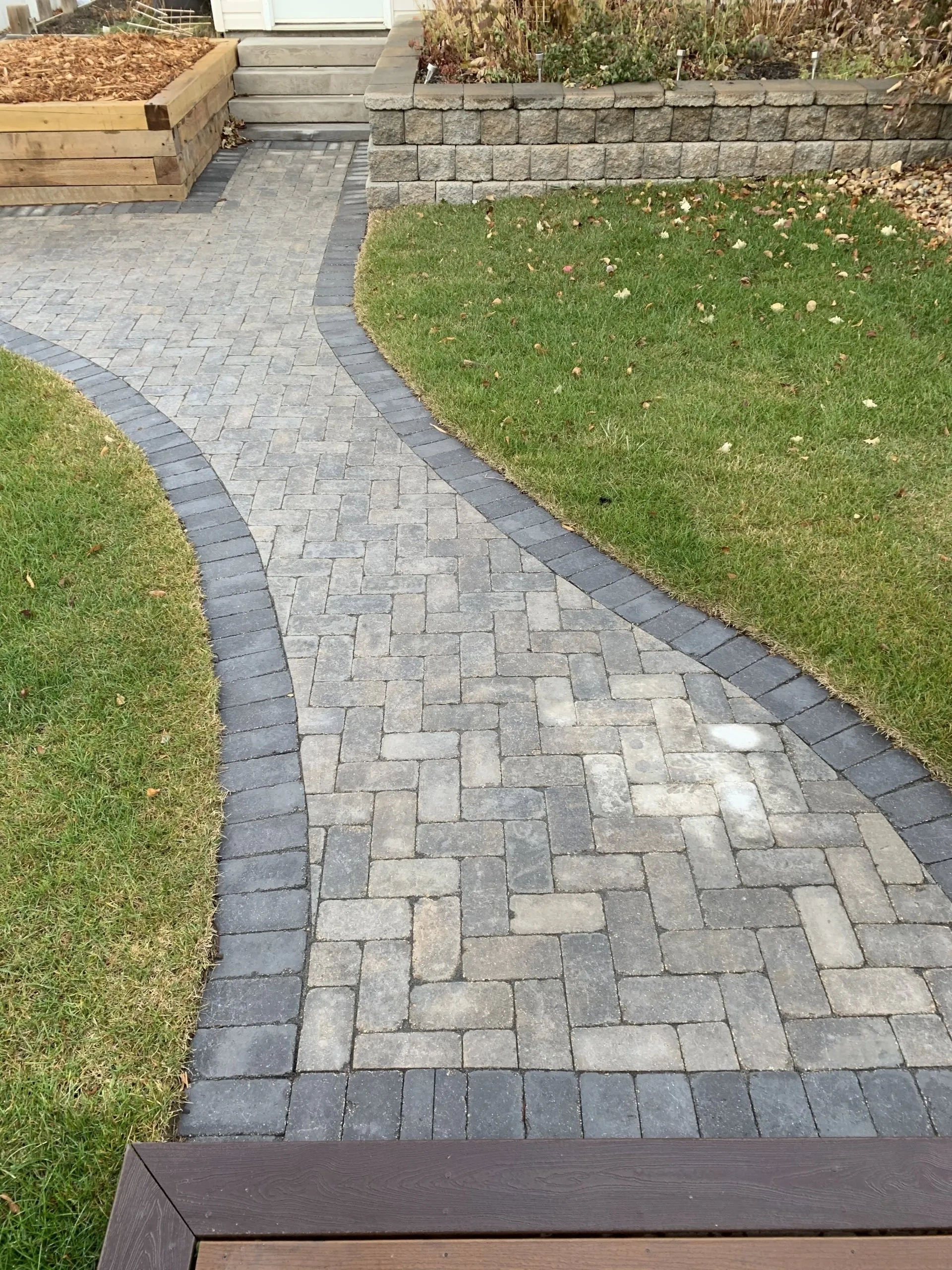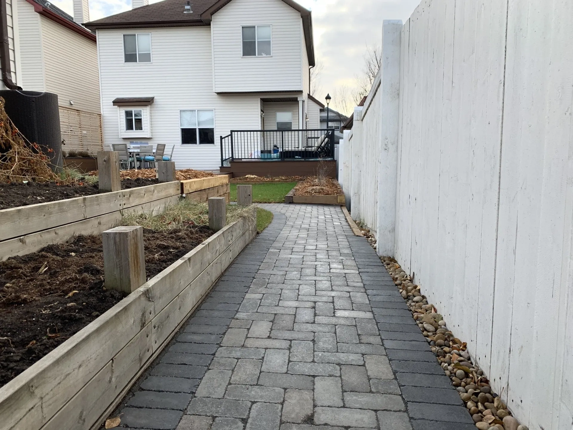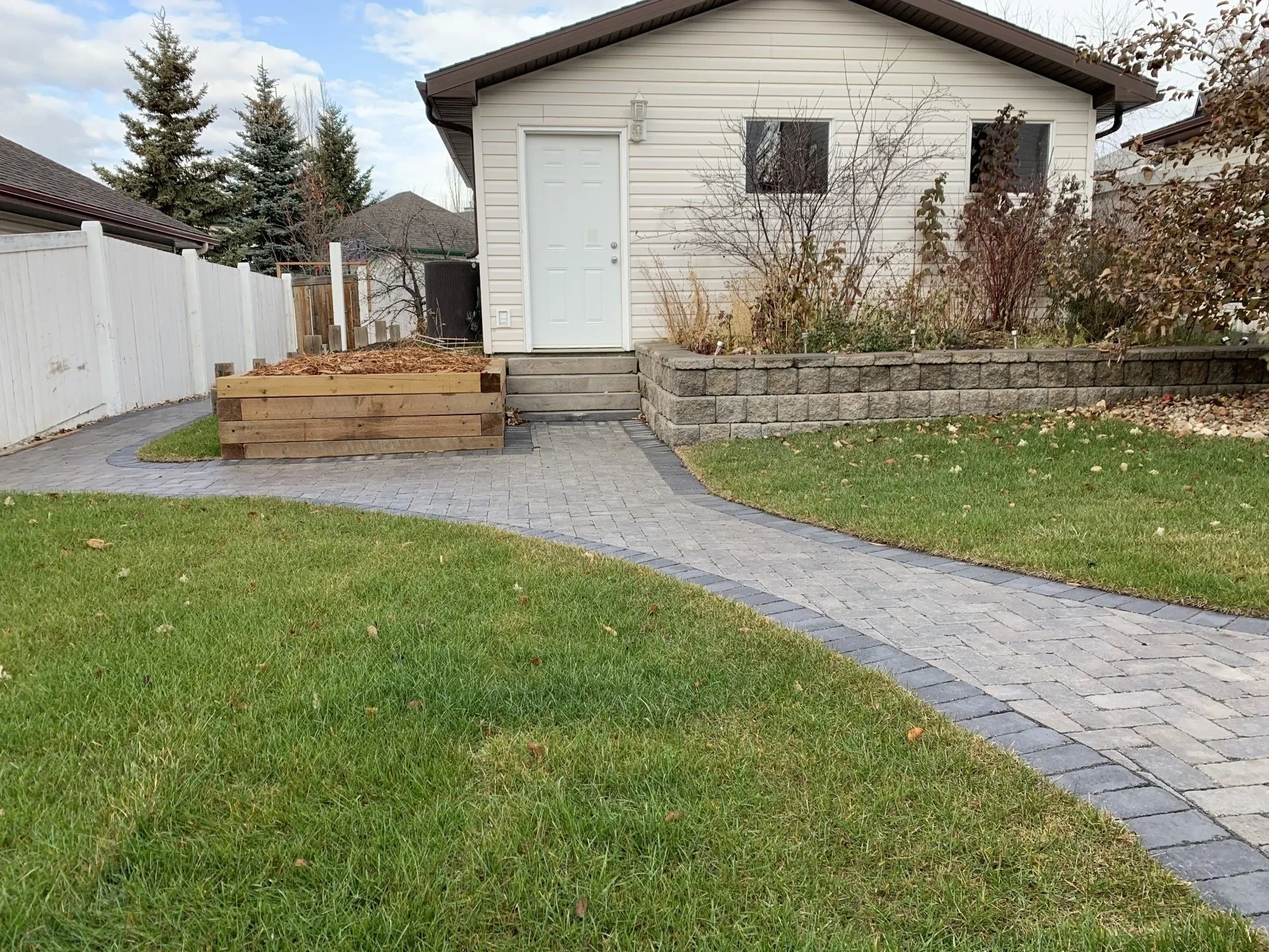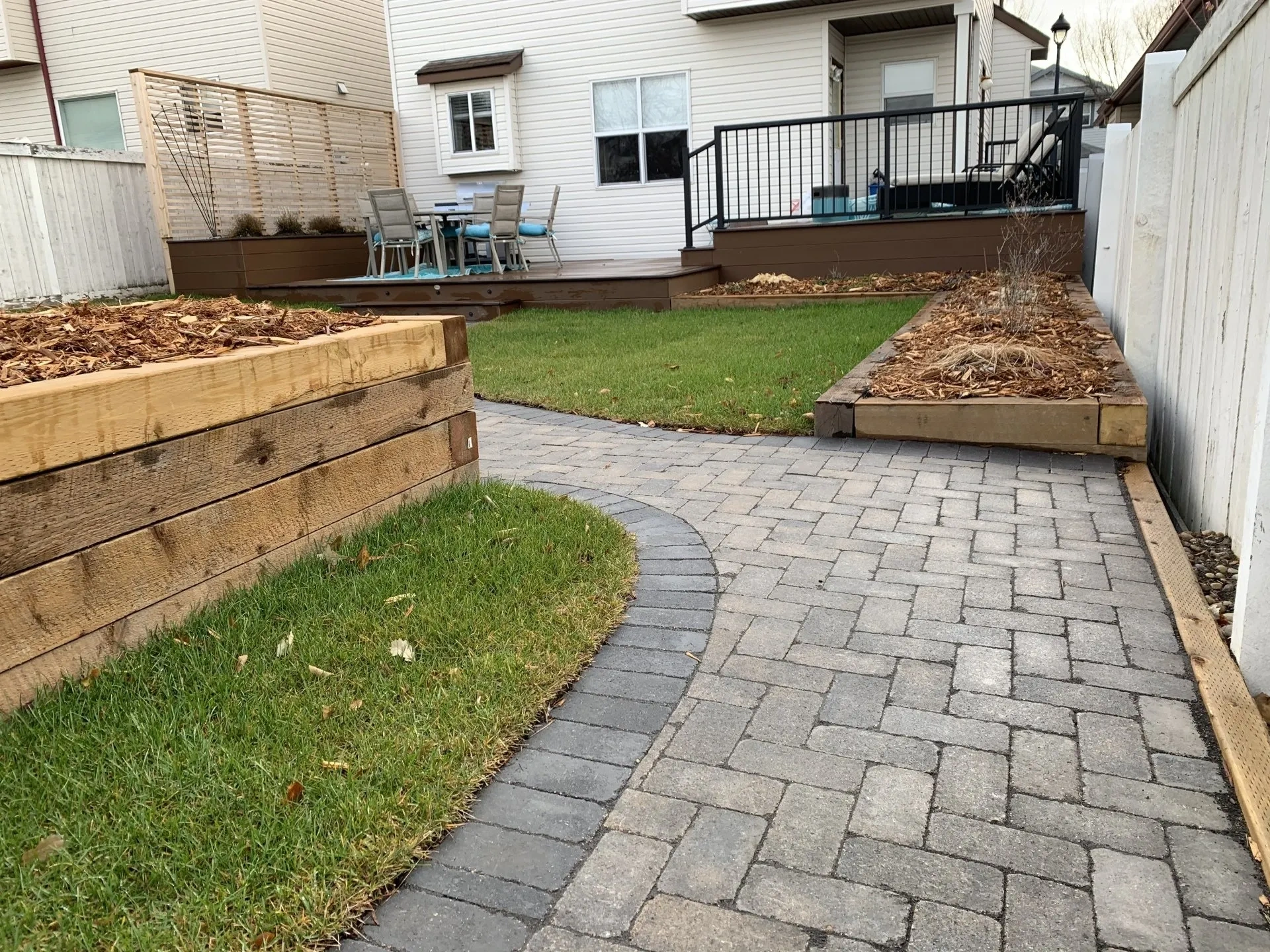 Newhart Landscaping did the planning and design for this cute backyard in Sherwood park. We installed New garden beds, Roman Paver walkway, new deck. New front walkway and steps and raised beds in front.